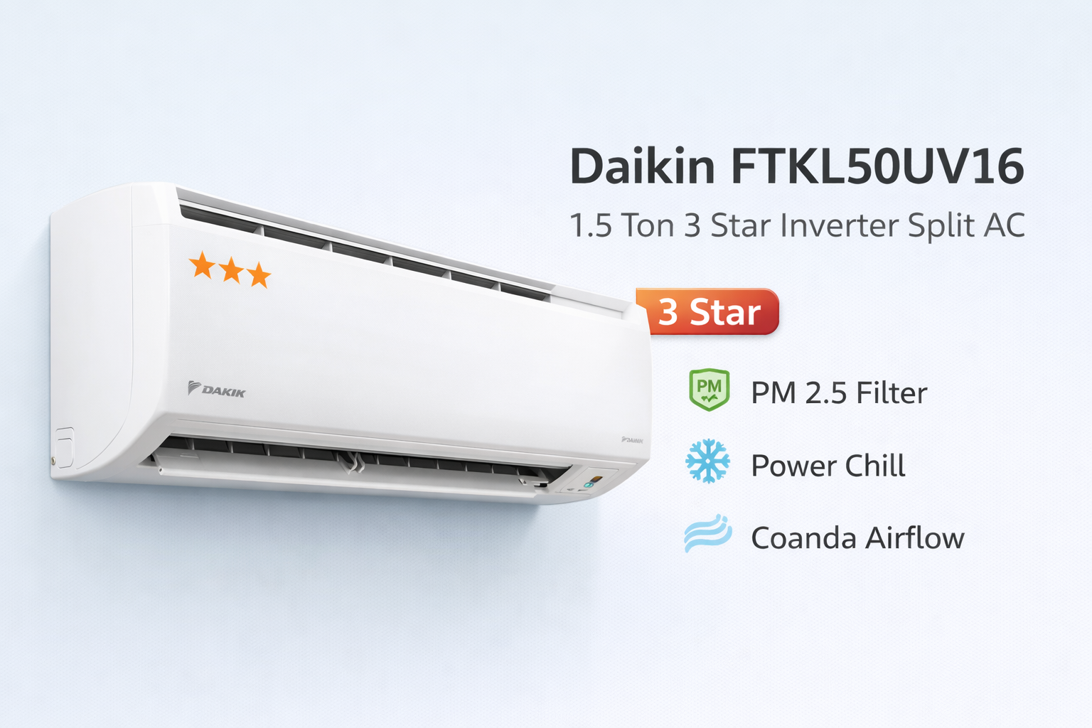 Daikin FTKL50UV16 1.5 Ton 3 Star Inverter Split AC, designed to deliver fast, uniform, and energy-efficient cooling for medium to large rooms. Built with Daikin’s trusted Japanese technology, this inverter AC ensures reliable performance, durability, and comfort even during peak summer heat.