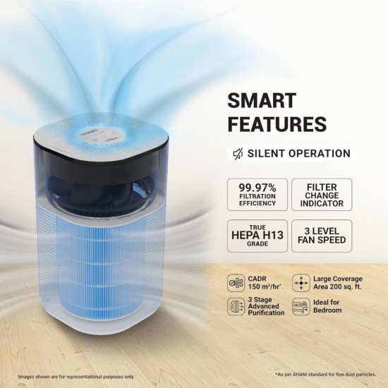 Eureka Forbes 150 Air Purifier, designed for small to medium rooms. Equipped with a True HEPA H13 Filter and 360° surround air intake technology, it effectively captures 99.97% of dust, particulate matter, pollen, allergens, and bacteria. The 3-stage purification system ensures clean air in every corner of your room up to 200 sq. ft., while operating at minimal noise — making it perfect for bedrooms, offices, or study areas. Compact, efficient, and easy to maintain, this purifier combines reliable performance with a sleek white design, providing a healthier environment for your family.