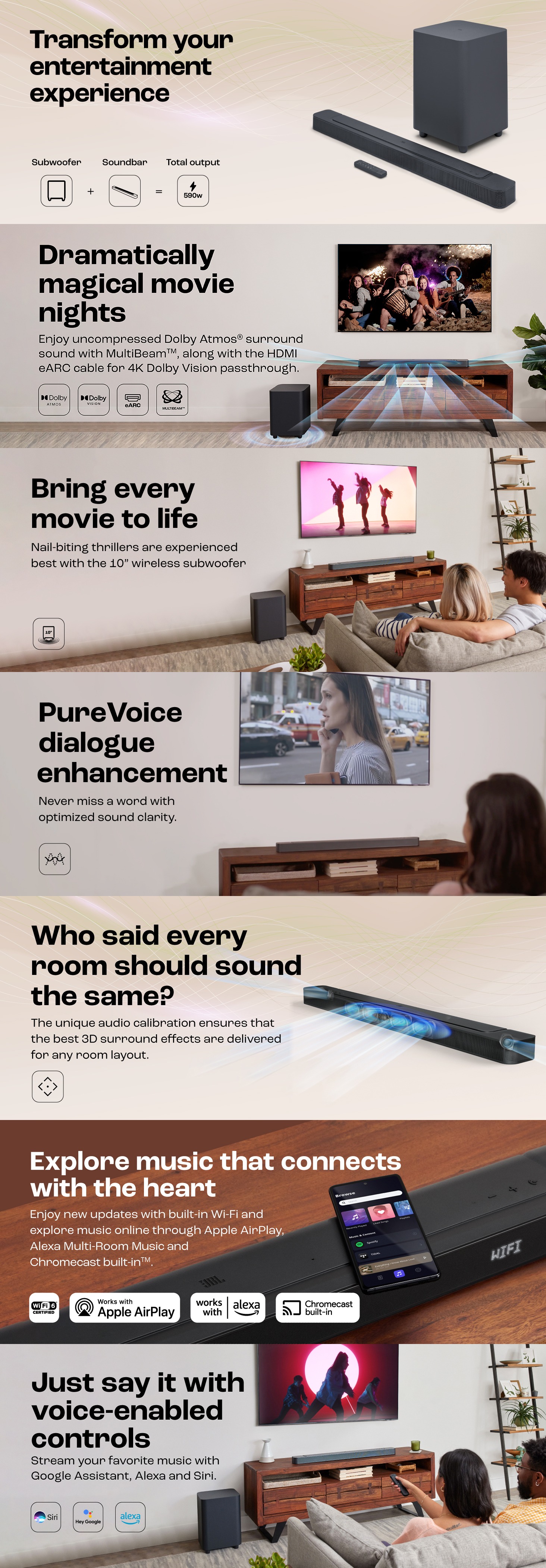 Connectivity is seamless and future-ready with HDMI eARC, allowing high-quality audio formats and 4K Dolby Vision pass-through for uncompromised picture and sound quality. The soundbar also supports Bluetooth and Wi-Fi, enabling wireless music streaming from smartphones and access to online music services. With the JBL One App, you can easily control settings, customize sound preferences, and manage updates from a single interface.