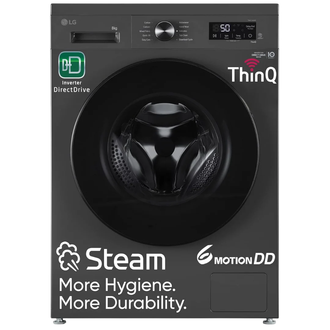 LG FHB1208Z4M 8 Kg Fully Automatic Front Load Washing Machine advanced Hygiene Steam aur Inverter Direct Drive Technology ke saath best-in-class wash quality deliver karti hai. 6 Motion Direct Drive technology alag-alag fabric types ke liye specially designed drum movements use karti hai, jisse kapdon ki deep cleaning ke saath unki softness aur durability bhi bani rehti hai. Hygiene Steam feature high temperature steam ka use karke kapdon se 99.9% tak allergens aur bacteria ko reduce karta hai, jo sensitive skin aur family use ke liye ideal hai. 5 Star energy efficiency ke saath yeh washing machine kam electricity aur paani me powerful performance deti hai, jisme energy consumption sirf 0.07 kWh/kg/cycle aur water consumption 8.2 L/kg/cycle hai. 1200 RPM spin speed kapdon se extra paani nikal kar faster drying me madad karti hai. Wi-Fi enabled LG ThinQ App ke through aap wash cycles ko remotely control, monitor aur naye wash programs download kar sakte hain. Fully stainless steel drum, tempered glass door, silent operation, child lock aur auto restart jaise smart features is washing machine ko modern homes ke liye ek reliable aur premium choice banate hain.