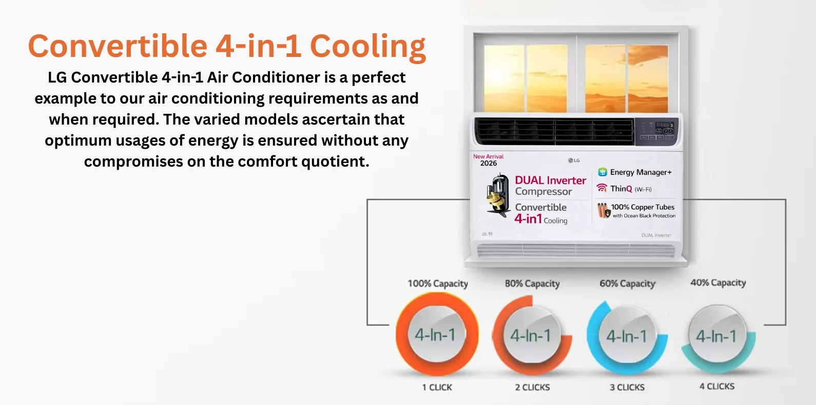 The Convertible 4-in-1 Cooling Technology allows you to adjust cooling capacity according to room conditions and usage. Instead of always running at full power, you can select different cooling levels for better efficiency.