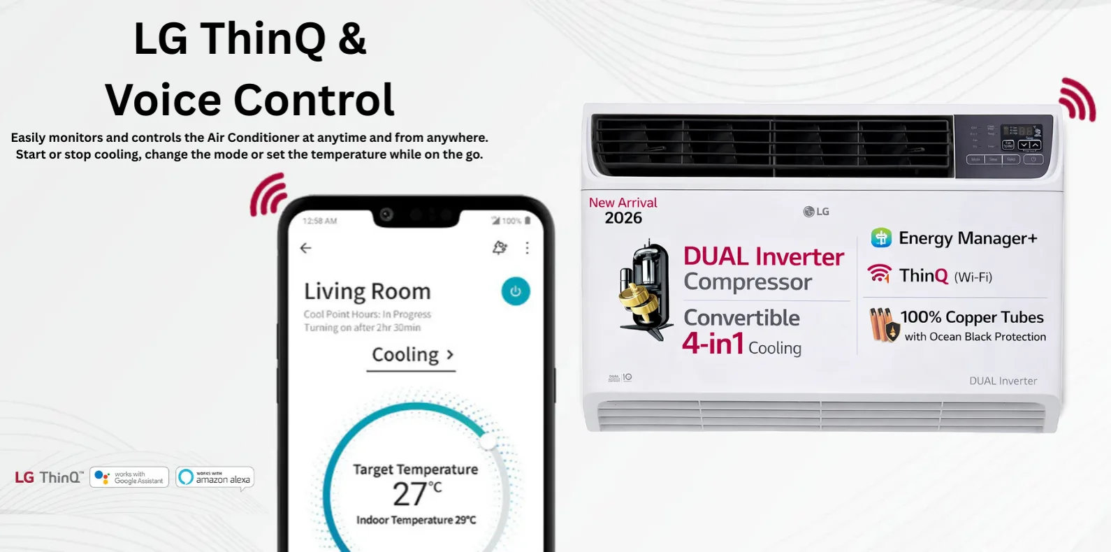 The LG AW-Q24WWXA 2 Ton Dual Inverter Window Air Conditioner (2026 Model) is specially engineered for large Indian rooms and extreme summer conditions. Designed with advanced inverter technology, smart connectivity, and durable components, this powerful window AC delivers fast cooling, excellent energy efficiency, and whisper-quiet comfort.