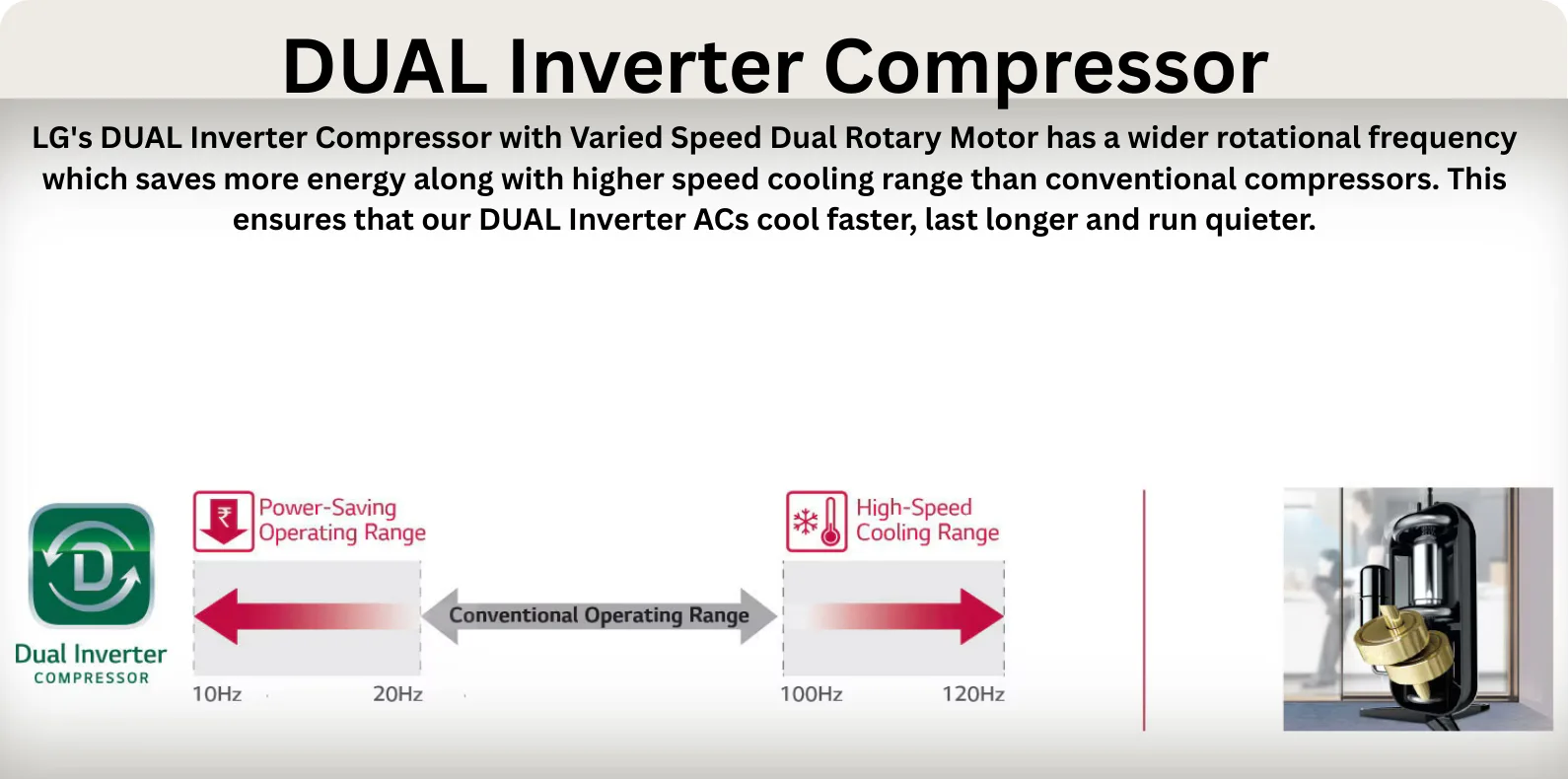 LG Dual Inverter Compressor – Fast, Quiet & EfficientAt the heart of this AC is LG’s advanced Dual Inverter Compressor, which dynamically adjusts compressor speed according to cooling demand. Unlike traditional compressors, it operates smoothly without constant start-stop cycles.