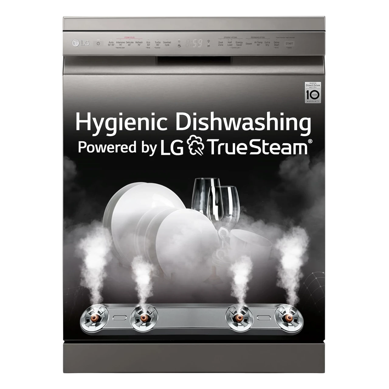 The powerful QuadWash™ system uses four multi-motion spray arms to cover every angle, ensuring spotless cleaning on all utensils. Its Inverter Direct Drive Motor not only provides superior performance but also operates quietly and efficiently, saving both water and energy.