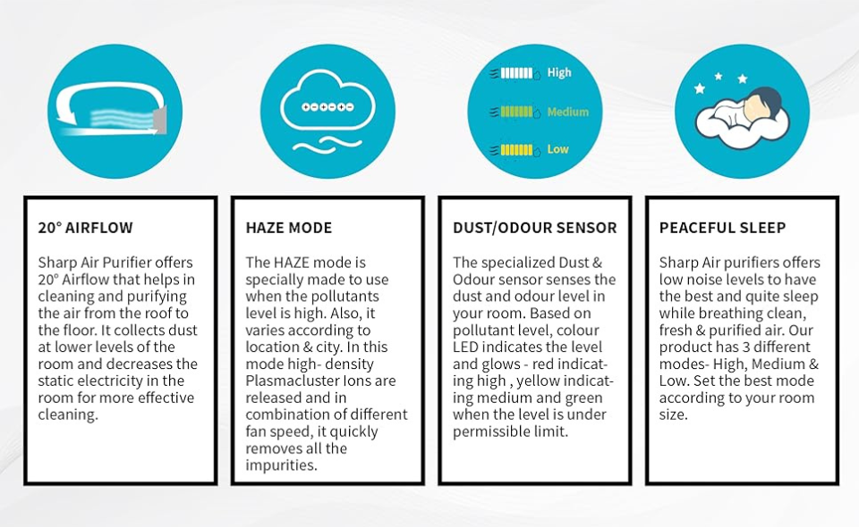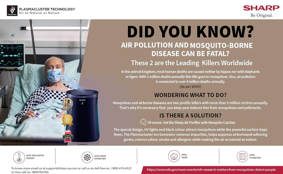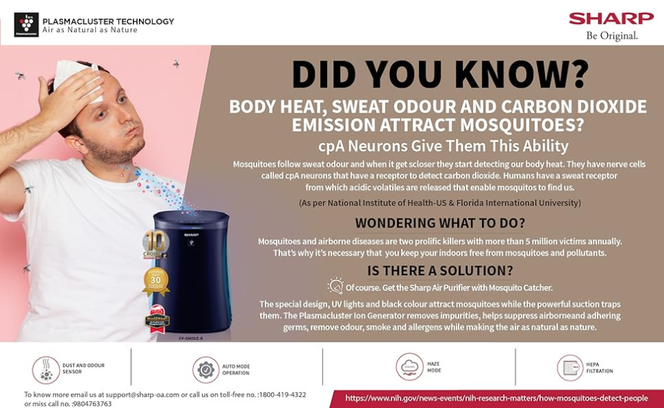 Sharp FP-GM50E-B Air Purifier, engineered with Japan’s advanced Plasmacluster Ion Technology to actively eliminate airborne microbes, viruses, allergens, and odors. This purifier stands out with its unique mosquito catcher feature that uses UV light and suction to trap and kill mosquitoes—making it ideal for Indian households. It comes equipped with a True H14 Grade HEPA Filter that efficiently traps 99.97% of particles as small as 0.3 microns, including dust, pollen, smoke, and pet dander.