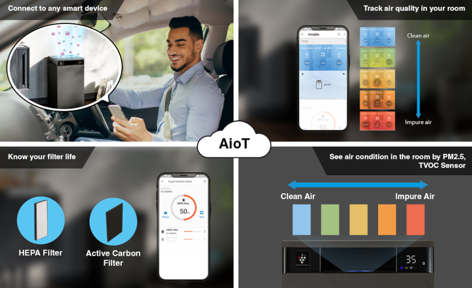 With PM2.5 & TVOC sensors, see the actual air condition in your room. The color-coded display shows whether your air is clean, moderate, or impure.