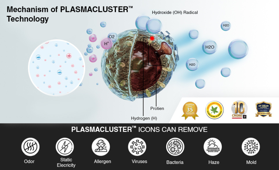 Sharp’s Plasmacluster™ Ion Technology is a globally recognized innovation that purifies the air by releasing positive (H⁺) and negative (O₂⁻) ions. These ions combine with harmful airborne particles, bacteria, and viruses to form Hydroxyl (OH) radicals, which instantly bond with hydrogen in protein structures. This reaction breaks down pollutants and converts them into harmless water molecules (H₂O), ensuring cleaner, safer air.