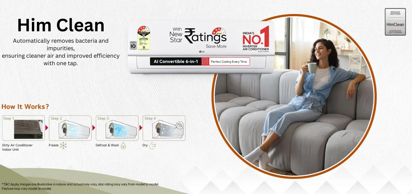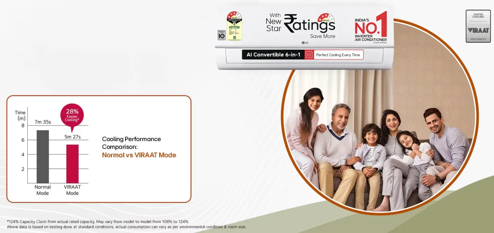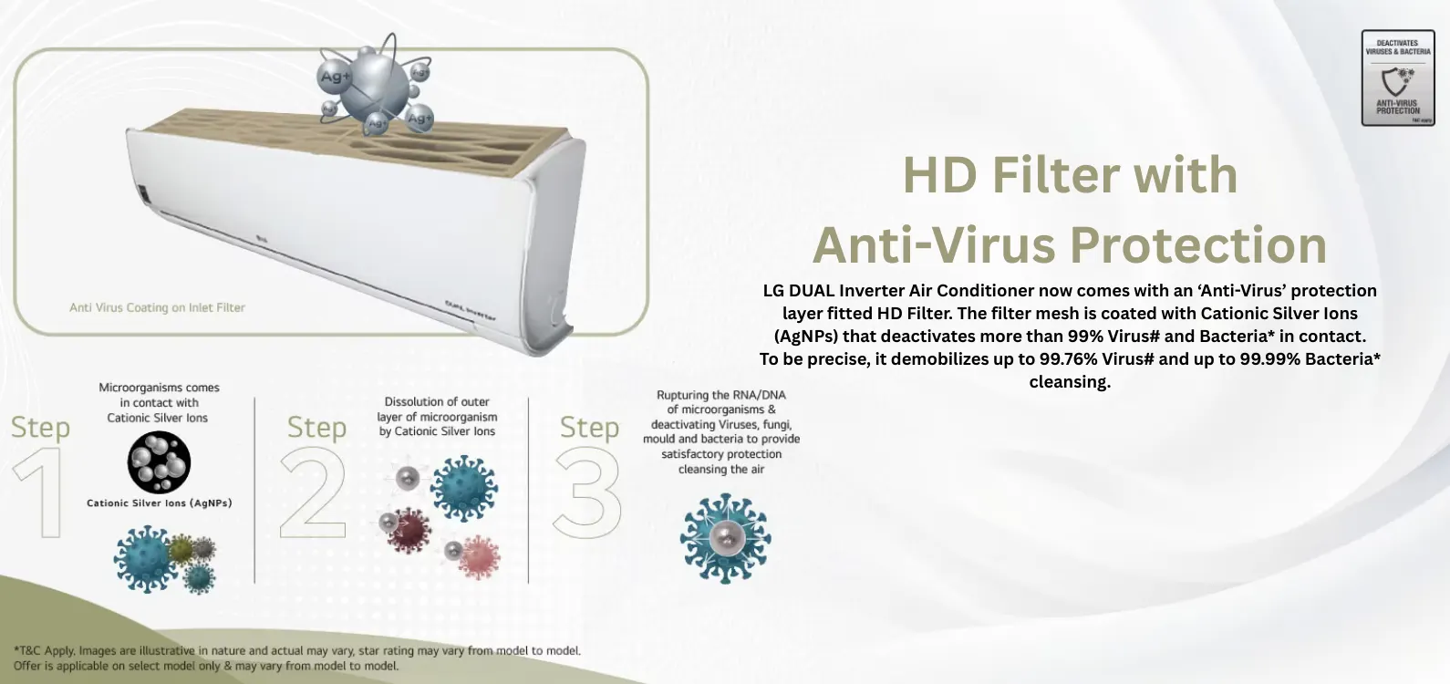 With Viraat Mode, the AC delivers instant high-speed cooling during extreme summer heat, while Diet Mode+ intelligently limits power consumption to help lower electricity bills without compromising comfort. The high-performance 5.0 kW cooling capacity ensures quick and uniform cooling across the room. Equipped with an HD Filter with Gold Fin+ coating, the AC enhances air quality and protects the condenser from corrosion, extending the life of the unit. Built with durable copper tubes and finished in an elegant white design, the LG AS-Q19MNXE combines smart technology, durability, and modern aesthetics, making it a reliable and value-for-money choice for Indian homes.